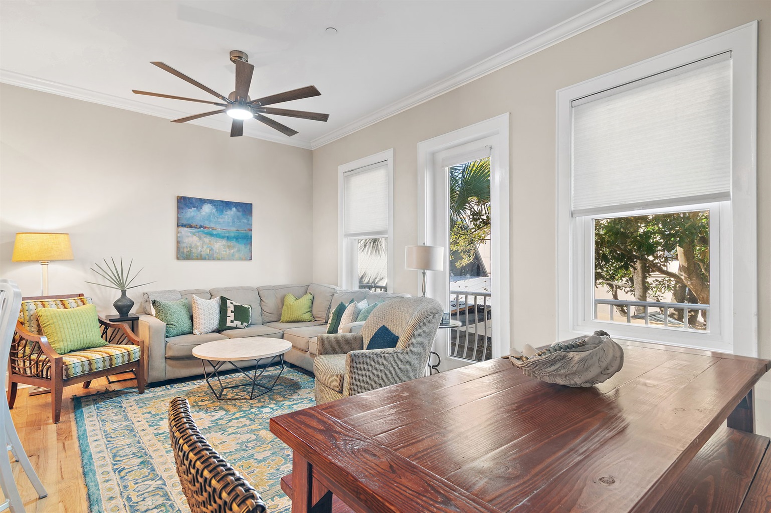 • Open concept kitchen/ living/ dining room with 75" smart TV and lots of seating